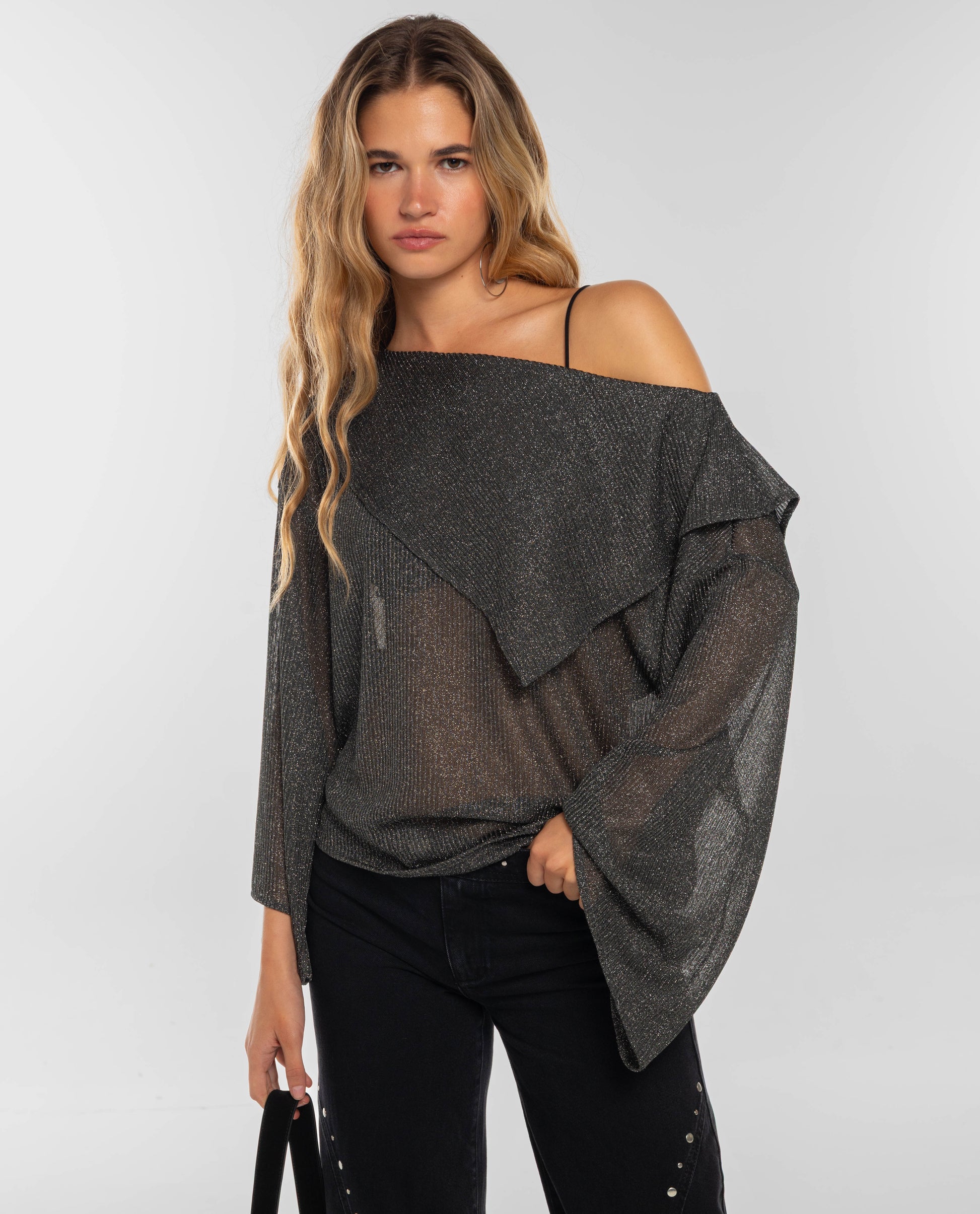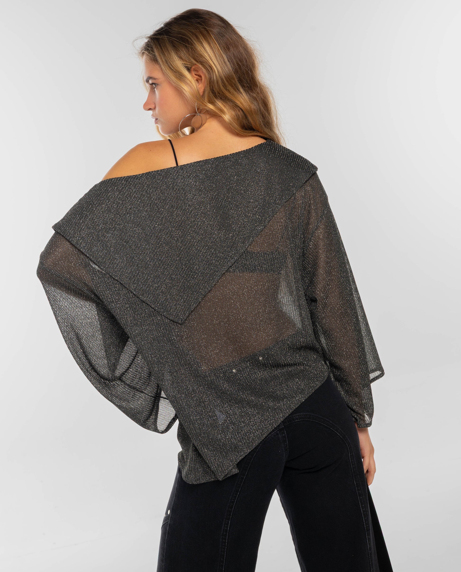 Blusa fluida gris con lúrex y diseño asimétrico en mangas y escote. [readmore]Ligera, cómoda y con mucho rollo. Esta blusa es de esas que te salvan cualquier look sin pensarlo mucho. Tiene un diseño suelto y muy cómodo, con caída fluida y un punto ligero con lúrex que le da un toque especial. El escote asimétrico, tanto delante como detrás, y los acabados desiguales en el bajo y las mangas lo hacen diferente. Llévalo con vaqueros, faldas o pantalones de traje, tú eliges el plan.