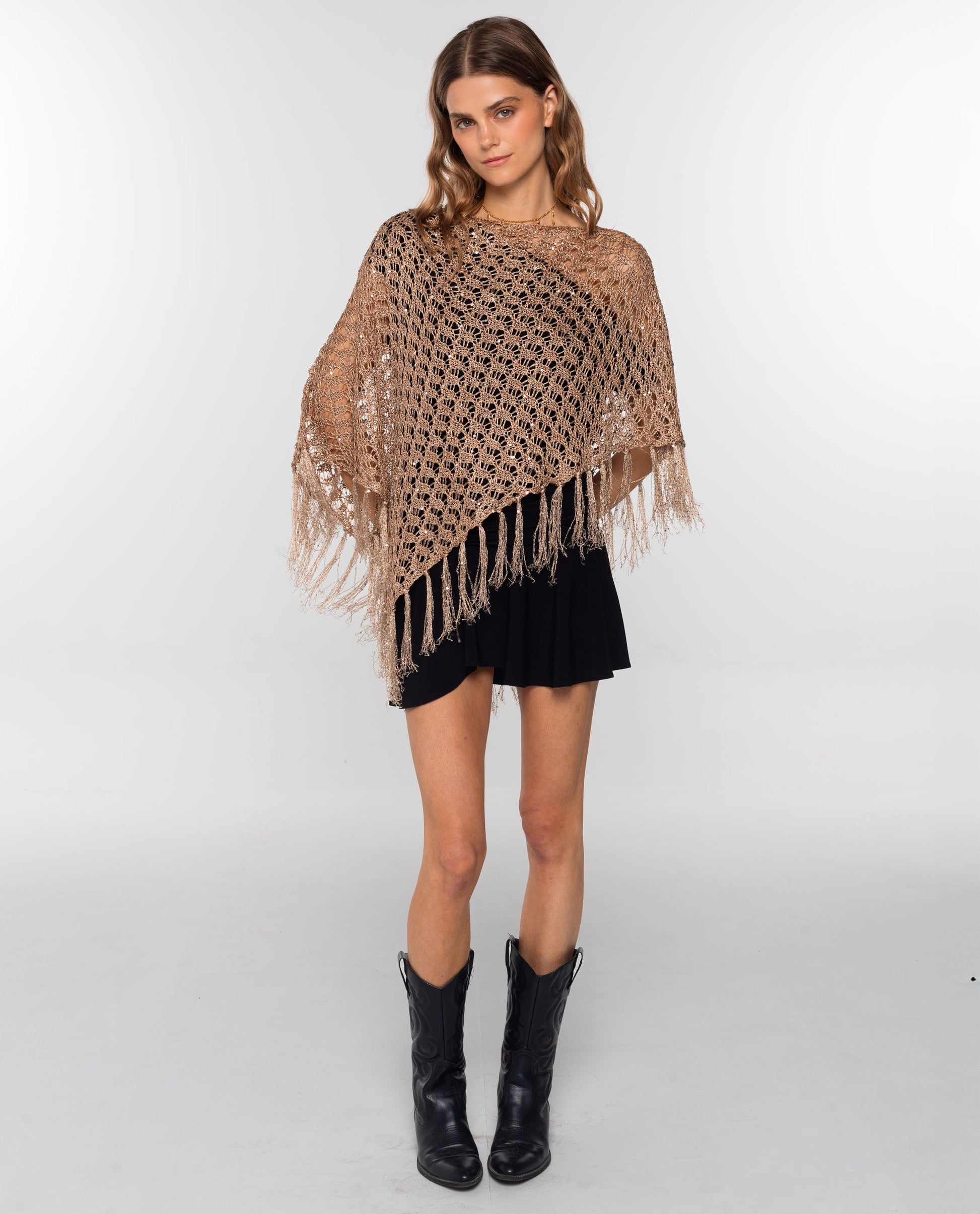 Capa de pico con flecos y acabado brillante.[readmore]Esta capa sin duda es la pieza ideal para completar cualquier look con un toque de brillo sutil y divertido. Confeccionada con un hilo especial que incorpora pequeñas lentejuelas, su acabado aporta luz de forma delicada sin recargar. Su corte en pico estiliza la silueta y le da ese toque trendy al diseño, junto con los flecos largos que aportan movimiento a cada paso. Es una prenda súper versátil pensada para eventos, noches especiales o para elevar tus looks más sencillos. Se adaptará a tu estilo en cada uno de tus looks!