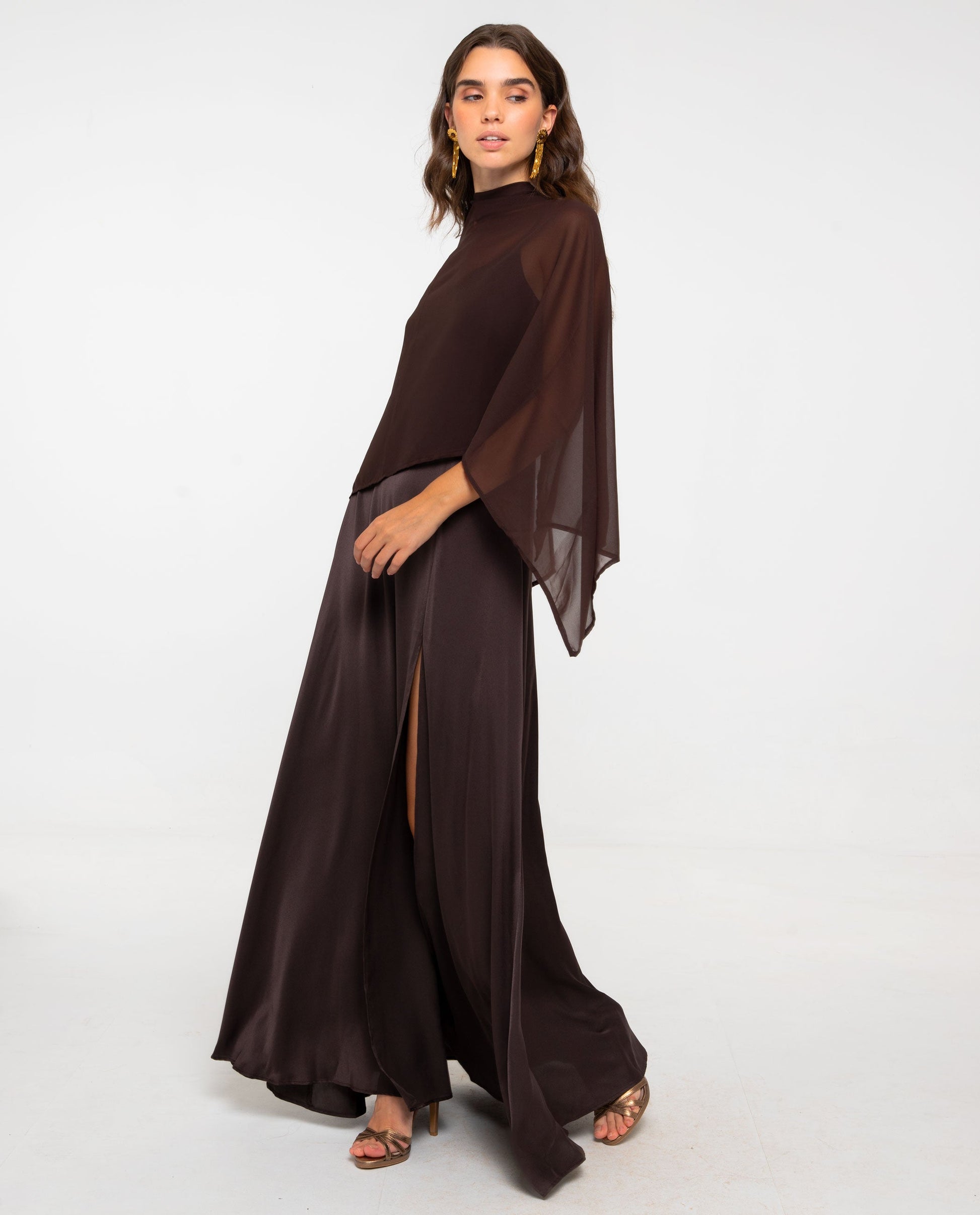 - Capa de invitada en tono marrón.