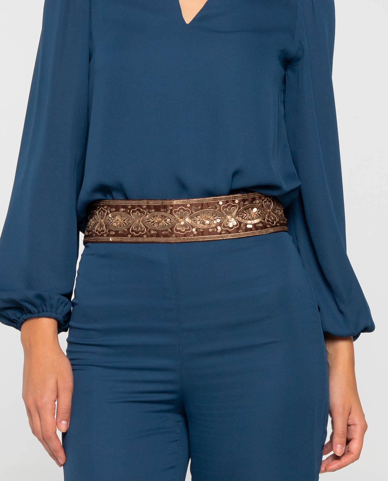 Cinturón marrón de tela bordada con lentejuelas oro viejo y cordón de cierre.[readmore]Este estilo de cinturón es uno de los complementos más buscados de la temporada. Este cinturón lo hemos diseñado con una base en forma rectangular. Sobre el tejido en tono marrón, hemos añadido un bordado de lentejuelas en oro mate. Lo podrás llevar atado a la cintura, cadera o donde prefieras gracias a sus cordones en las puntas. Ideal para combinarlo con los looks de nuestra colección de invitada o sobre unos vaqueros.