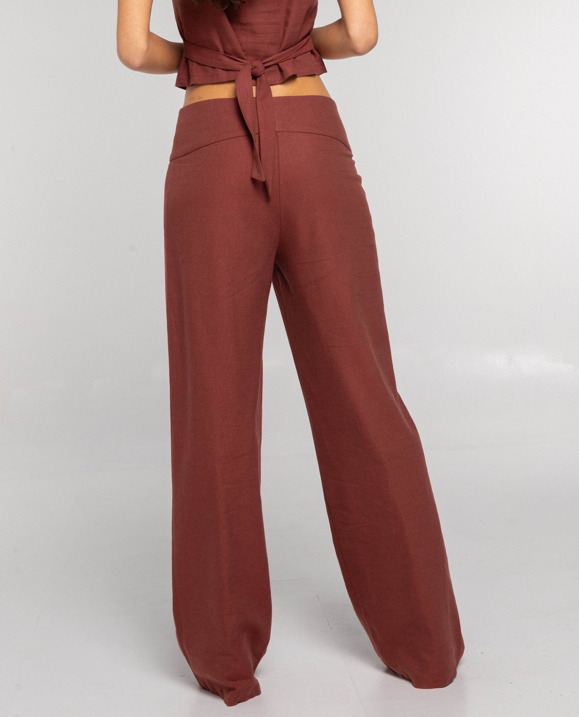 Pantalón de corte recto y tiro bajo, con cinturilla ancha y cierre de dos botones forrados con cremallera. Lo mejor es llevarlo con el chaleco a juego; así tienes un total look listo sin pensar, elegante y effortless.