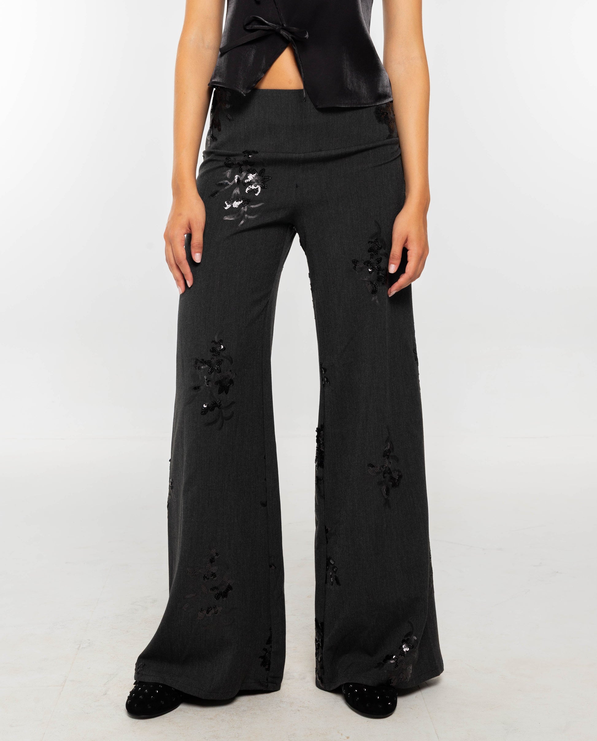 Pantalón largo de talle bajo y pata ancha gris con bordados florales de lentejuelas negras.[readmore]Si estás en búsqueda de esos pantalones classy but cool, sin duda estos son tus pantalones. Nada más ver el tejido nuestro equipo de diseño supo que querría tenerlo en la colección. Han diseñado estos pantalones largos de talle bajo con cremallera lateral. El camal es ancho, para un estilo effortless cool.[sizes]La modelo de estudio mide 1.77 y lleva habitualmente la XS de top y 34 de pantalón. De este pantalón lleva la talla XS.
