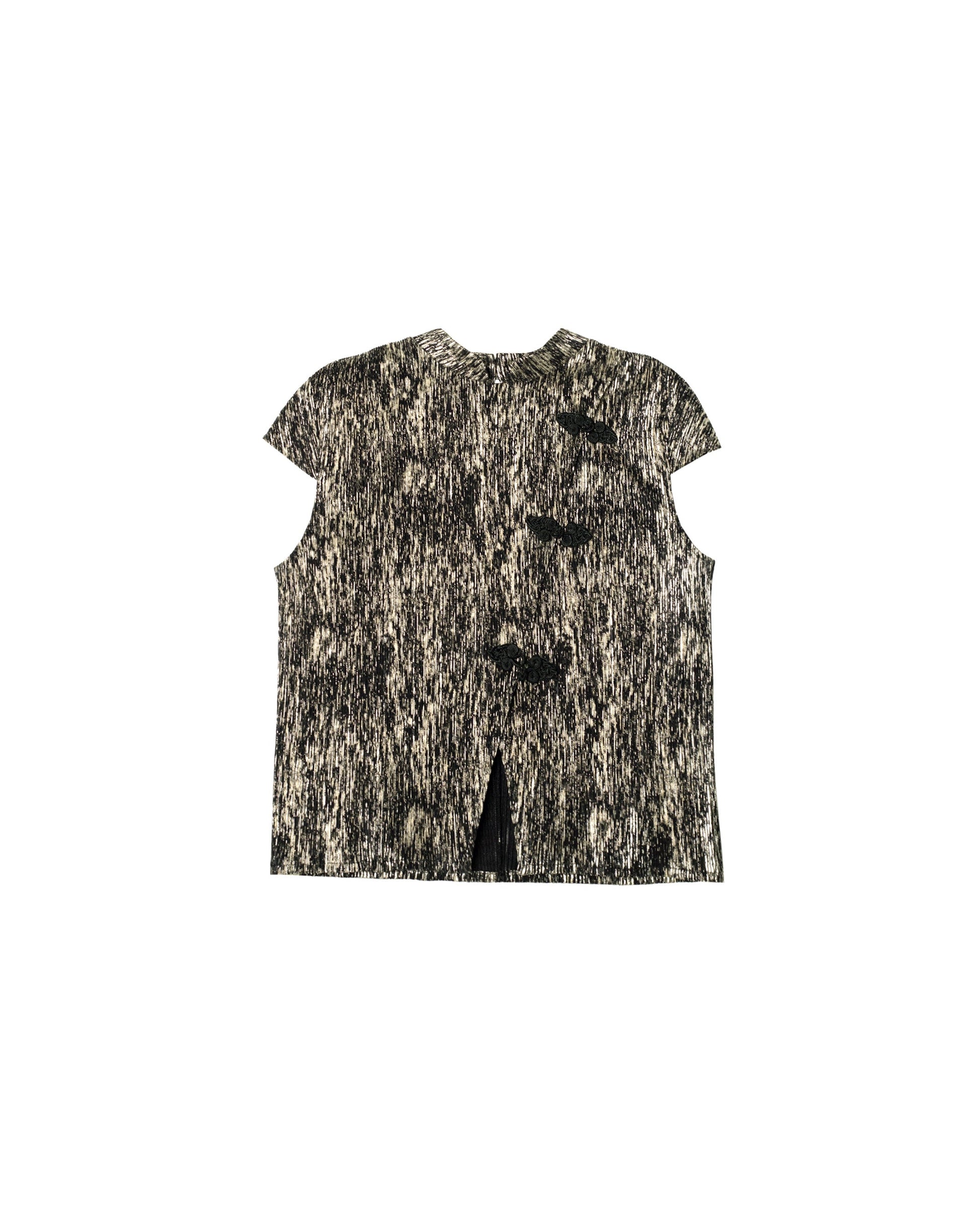 Top estilo quipao en tejido plisado dorado y negro[readmore]Este top queda ideal con la falda a conjunto. El tejido es un plisado negro satinado con un print dorado por encima, tiene un efecto muy elegante. Tiene un estilo quipao con el cuello mao y alamares para cerrarlo en el delantero. Tiene manga pegada corta.[sizes]La modelo de estudio mide 1.68 y lleva habitualmente la XS de top y 34 de pantalón. De este top lleva la talla XS.